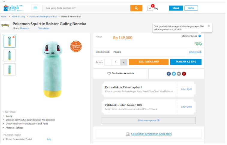 That’s right, you can purchase the Squirtle Pillow from Indonesian e-commerce site Blibi.com right now. According to the product photo, it’s got the “Original Licensed Characters” seal and under product features, it mentions “To accompany your child during their rest time”.