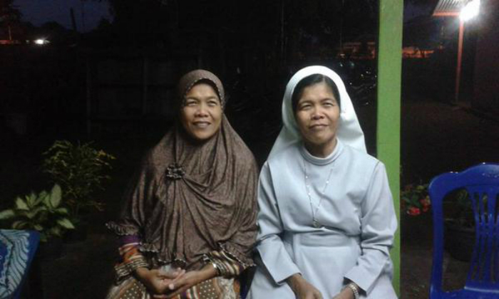 A photo showing what appears to be a pair of identical Indonesian twin sisters in Indonesia, one wearing the traditional Muslim hijab and one wearing the habit of a Catholic nun, has gone viral on the Indonesian twittersphere.