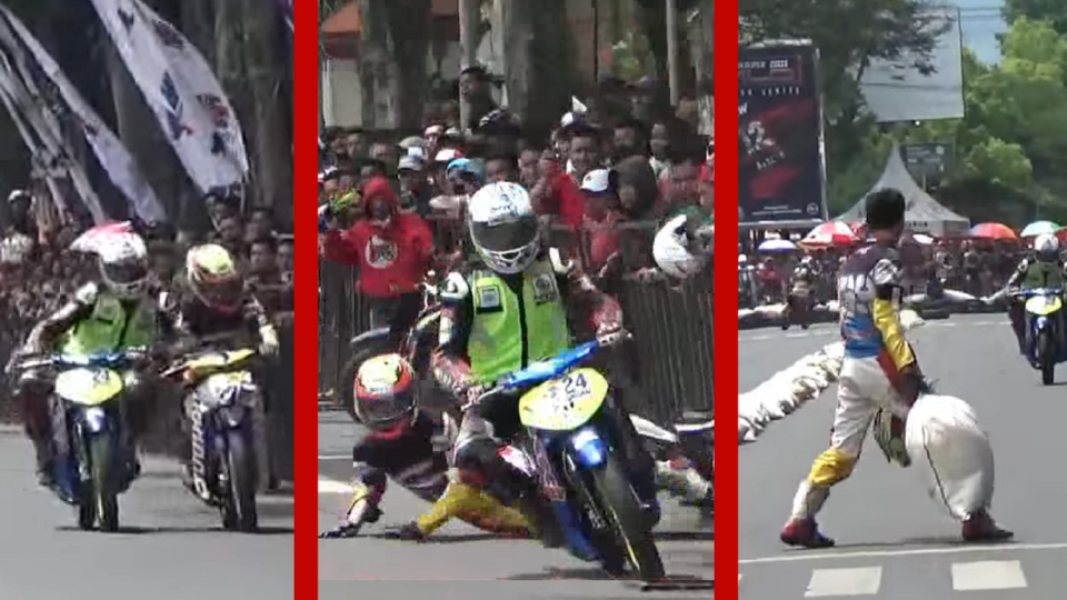 The incident took place at the East Java Series V Championship Road Race in Bondowoso on Sunday during the 116 cc class race. It starts when a driver, identified by the media as Dimas, gives a hard check to one of his competitors, identified as M Hasan, causing him to slam into the dividers protecting the spectators. Hasan hit the pavement hard and tumbles down the road, several spectators are knocked off their feet and Dimas drives away like nothing happened.