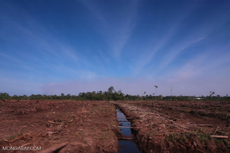 A drainage canal runs through a peatland cleared for oil palm in Riau, Indonesia. Peat is a marshy material that stores huge amounts of carbon. Photo by Rhett A. Butler