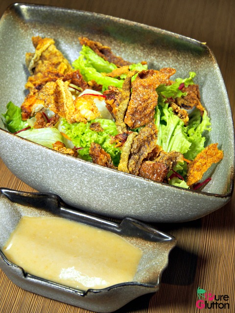 A good way to start off a meal here is to have a salad of greens topped with deep-fried softshell crabs and salmon skin (Soft Kani Karaage To Shake Kawa Sarada) and drizzled with sesame dressing.