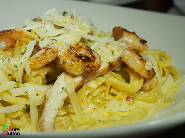 No Rules Pasta – I like the name of this item. Basically, it’s fettucini tossed in creamy parmesan cheese sauce with vegetables, chicken and shrimp or just any of the condiments – no rules at all.