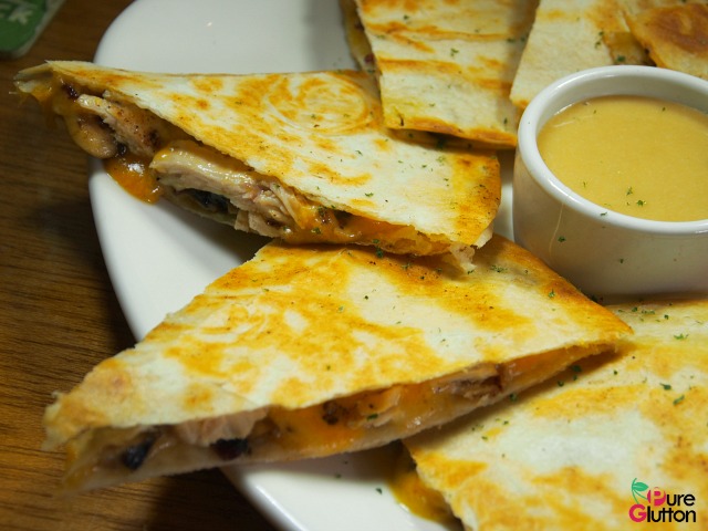 Their Alice Springs Chicken Quesadilla is another money-for-value item. It’s really stomach-fulfilling: grilled flour tortilla stuffed with grilled chicken breast, saute’ed mushrooms, beef bacon, melted cheeses and served with honey mustard sauce.