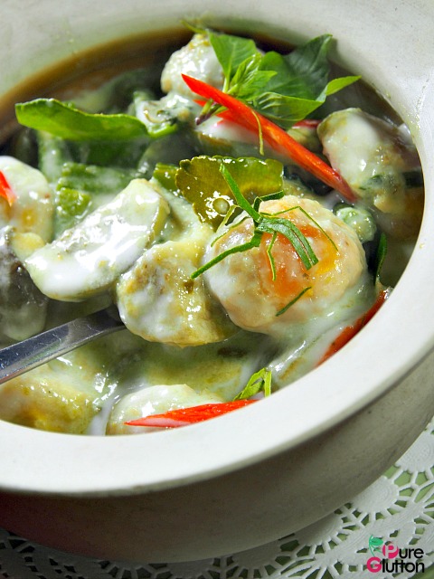 Green Curry is a staple in any Thai restaurant but Chef O has gone one step further by using Fish Paste stuffed with salted egg yolk instead of meats. Known as Gaeng Kiaw Loo chin Pla Yad Sai Khai Kem (RM28)…these are immensely good as the bold brash flavor of the salted eggs blends well with the spices.