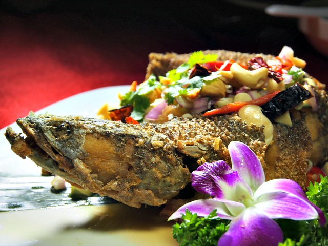 The Pla Chon Luw Sauw (RM70) is a conversation stopper; a whole deep-fried King Fish (freshwater snakehead) curls itself seductively amidst a pile of Thai herbs, chopped chillies, onions and crunchy cashew nuts sprinkled with lime juice.