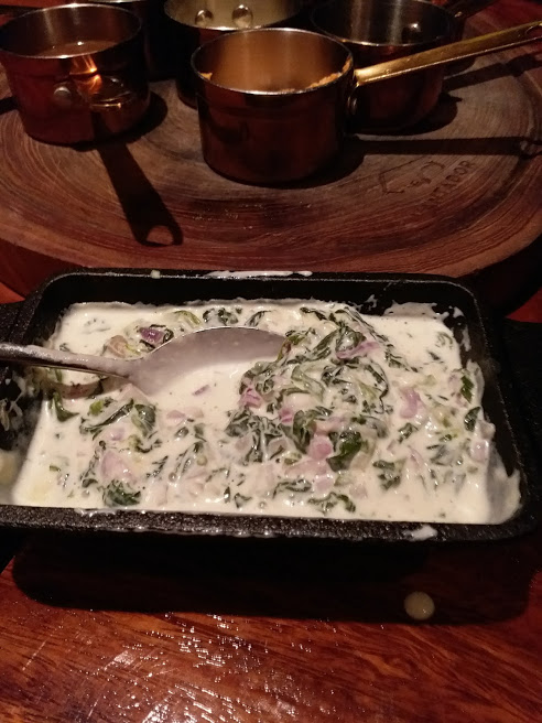 The spinach? Lovely. A riff on the steakhouse classic: Cooked with cream, but with finely chopped red onion to give it a bit of a kick and crunch.