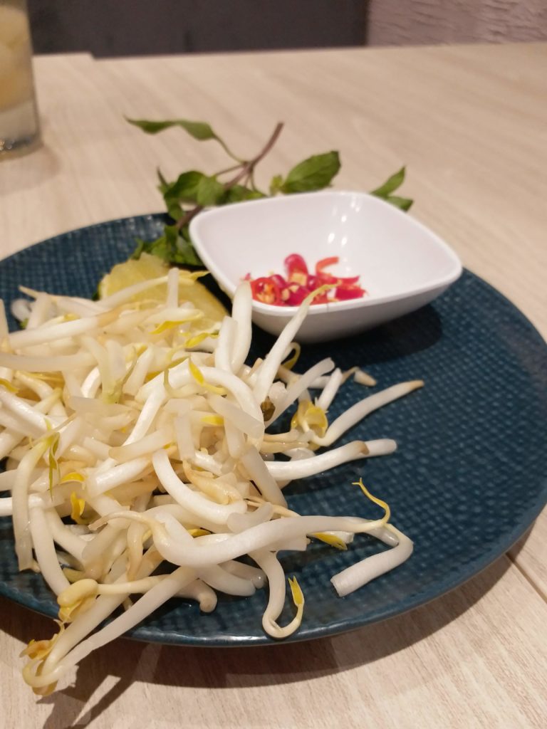 Medium rare sliced beef, slowly browning in our bowl, and a very necessary side of fresh bean sprouts, herbs, lime and chilies, to add at your own discretion.