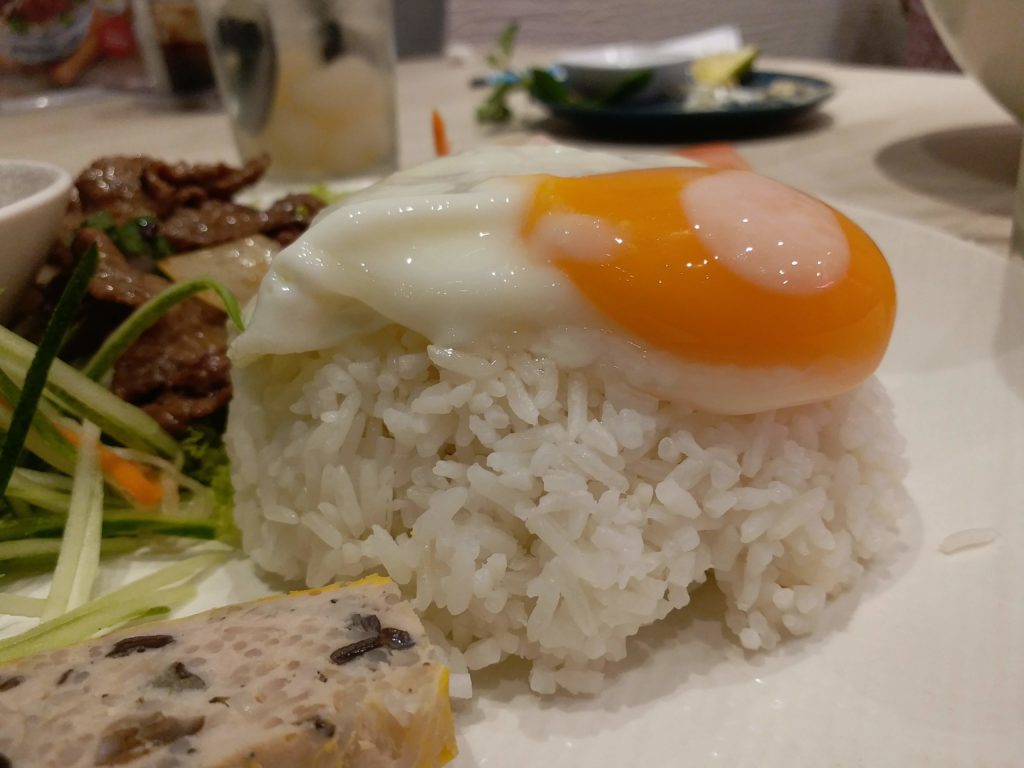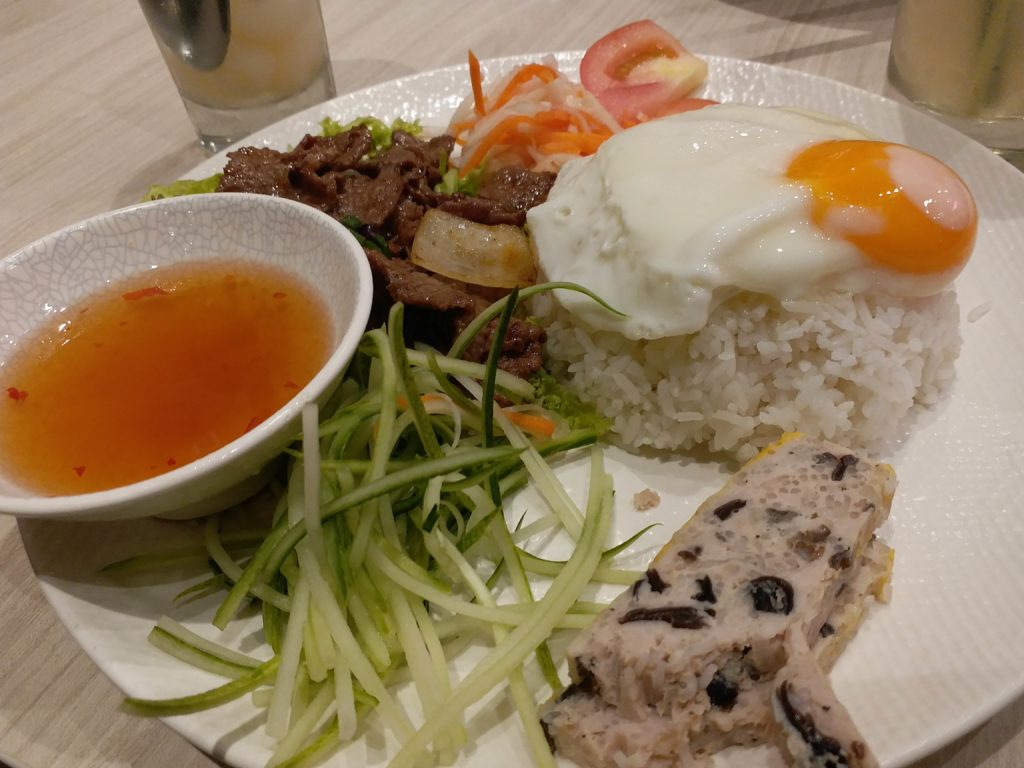 There are a couple of slices of something that looks like tempeh, but isn’t — it’s cha trung, a steamed egg meatloaf. It tastes better than it sounds, though this one was pretty mild tasting.