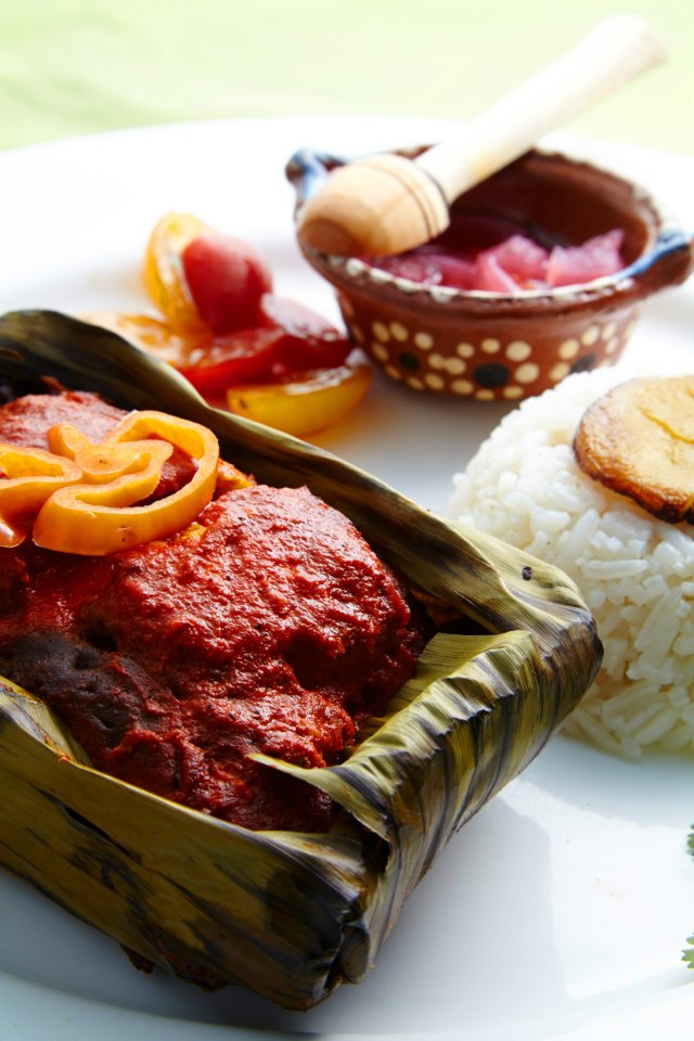 Succulent “Adobado” pork shank bathed in Chefs Carmela´s recipe of dried chilies and spices, slow cooked, served with white rice, “Frijoles Charros” and 4 corn tortillas.