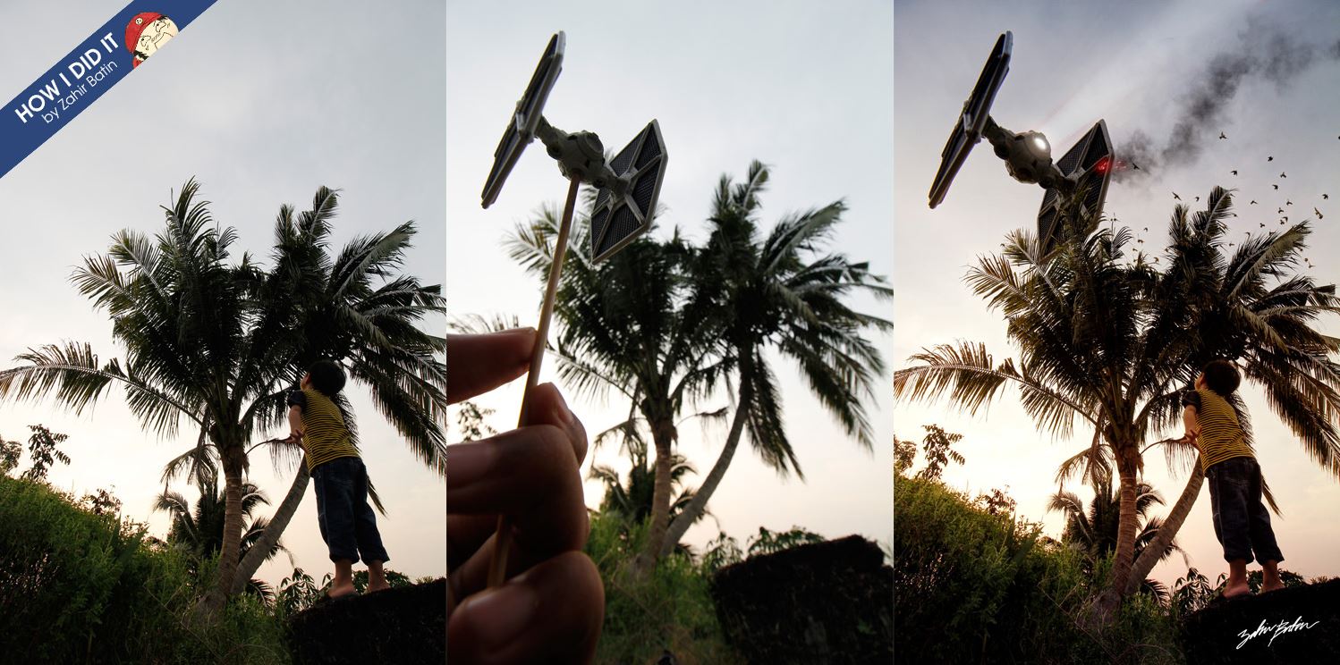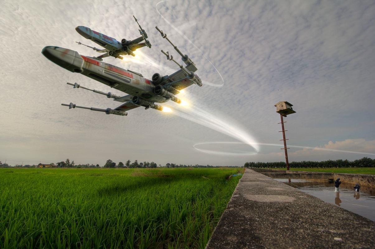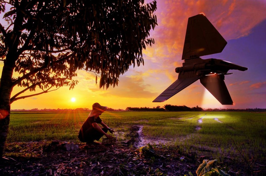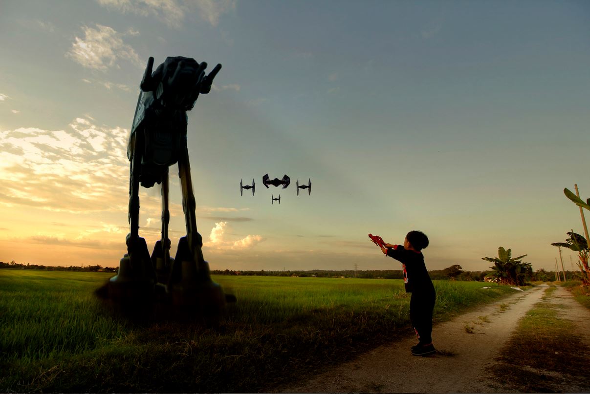 The intrepid photo artist juxtaposes humdrum kampung life with intergalactic conflict often with the simplest methods: multiple exposures of landscapes and toys held up by hand or wire, with colour corrections and airbrushing the wires out after the fact. Just like Goerge Lucas’s original trilogy, it seems the old ways work best.