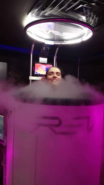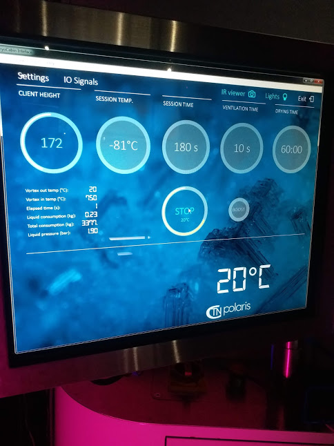 This means getting your kit off, putting on some boots, gloves and nipple tape, and standing in a cylindrical chamber while cold fumes get pumped out at you for as many minutes as you can handle. Temperatures can range anywhere from the -60 degrees Celsius range, all the way to -110.