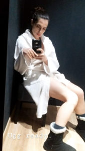 Our first employee of visceral fat fame reappeared. He would be explaining the process to us. First, you take your clothes off, including jewelry and slip on some faux Ugg boots, gloves, and a robe. Oh, and some nipple stickers lest your nips and areola feel the freezer burn a little too much. Hmm, not bad. Kind of stylish, in a wintry Hugh Hefner kind of way.