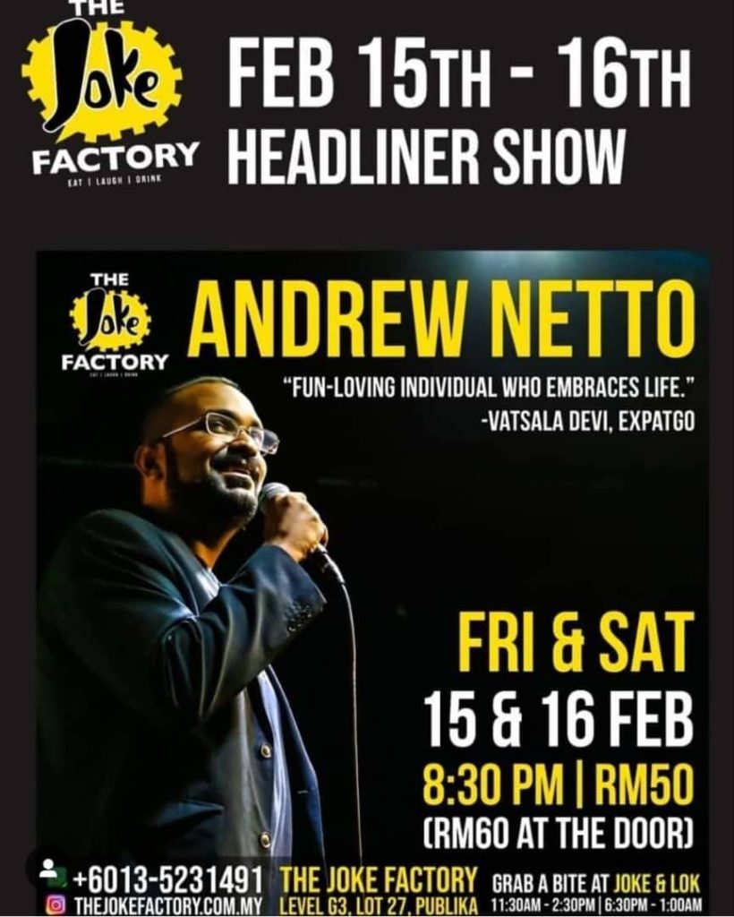 This weekend, one of our favorite comedians, Andrew Netto — one quarter of the Angry Indians comedy group — is doing gracing us with his good vibes, and many laughs, after a brief absence from the Kuala Lumpur comedy circuit last year.