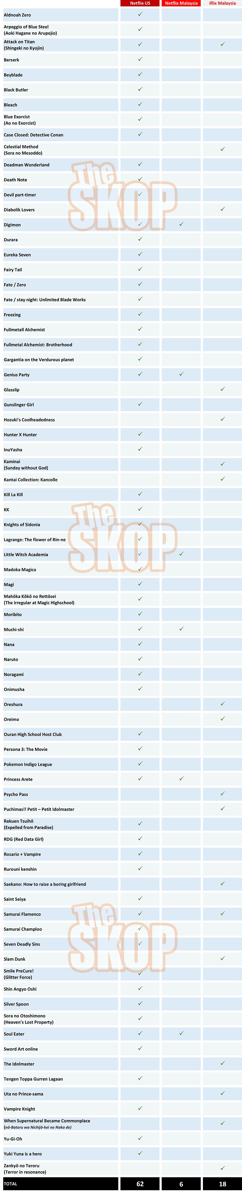 Adakah kedatangan Netflix di Malaysia, membawa senarai yang sama seperti Netflix US? Usah risau, kami dah periksa dan semak semua senarai anime ini. Di jadual di bawah ini, anda boleh melihat anime apa yang terdapat di dalam pustaka Netflix US, Netflix Malaysia dan iflix.