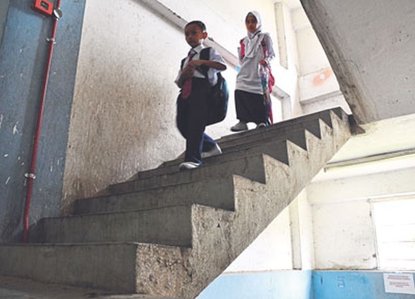 The Malay Mail’s Ushar Daniele yesterday visited the low-cost flat and discovered a number of unsettling structures. Among them were missing metal railings in stairways and corridors, faulty lifts, broken main water pipe and gaps between railings.