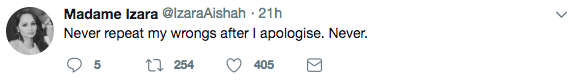 And finally, referencing that she never does the same wrong twice, which obviously doesn’t extend to saying soz: