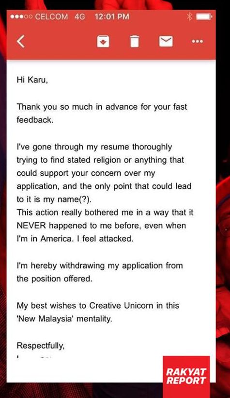 Surprised at the response, Kamil wrote back, telling CU that nowhere on his resume did it state his religion, nor any other indication of his faith, whatever it might be. He surmised that the recipient must have made assumptions based on his name.