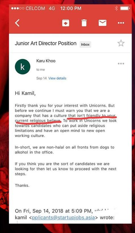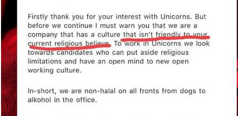 Creative Unicorn “warned” him that their “company culture” was not “friendly to his current religious beliefs.” Working at their agency, apparently, meant that Kamil would have to “put aside religious limitations, and have an open mind to a new open working culture.”