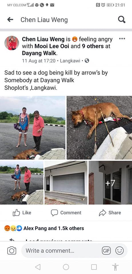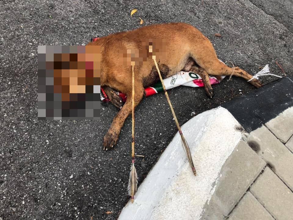 The incident occurred outside of a convenience store in Dayang Bay that is open 24 hours, and was only brought to police attention after a woman saw a post of the dead animal on Facebook, showing the canine laying on the ground with two arrows on its body.