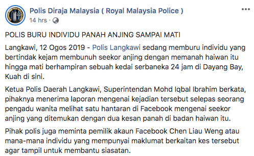 Investigators are asking anyone with any information to come forward, including the owner of the original Facebook post, Chen Liau Weng.