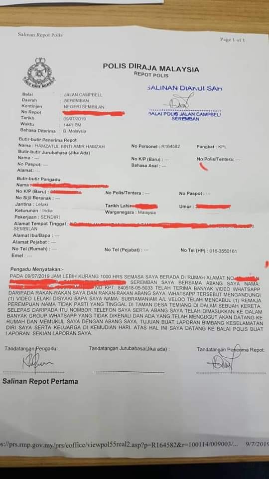 Both my number and my brother’s number were included in the video and we have been receiving many threats on WhatsApp. There have been threats to come to our house to beat us up. We are making this police report because we fear for our safety.