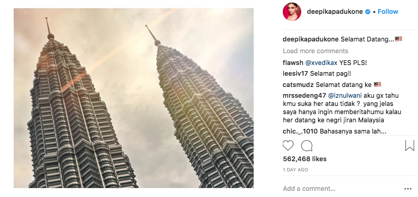 Alert your favorite cousin, the world-famous celebrity was spotted taking photos of the city’s iconic Petronas Twin Towers, later posting the pic to Instagram along with the caption: Selamat Datang (Welcome).