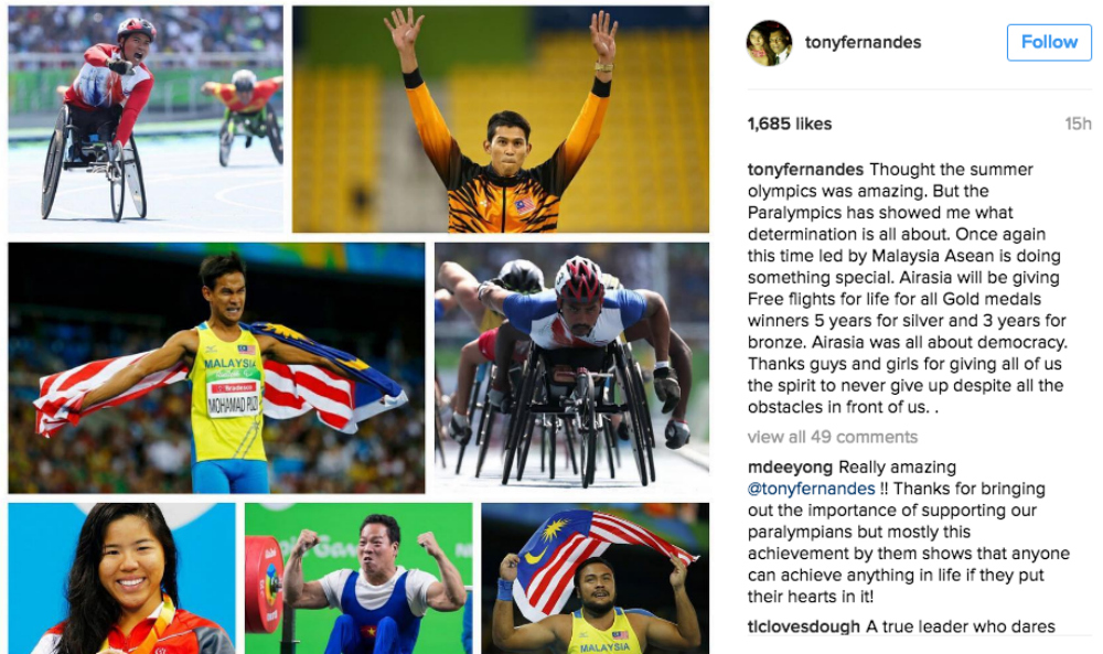 Just like their able-bodied counterparts, all Asean Paralympians who won the gold medal at the ongoing Paralympics in Rio de Janerio will be entitled to free flights from AirAsia, its group CEO Tony Fernandes announced on Monday.