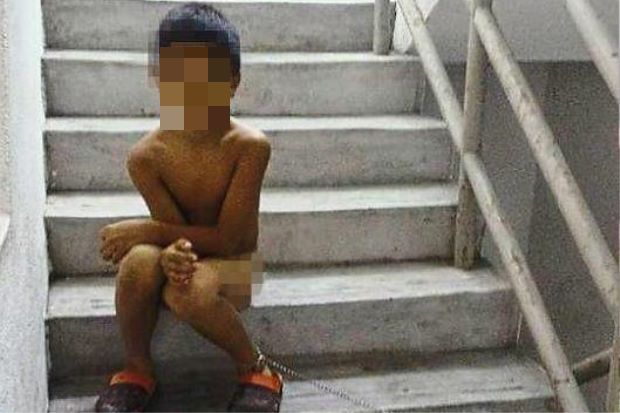 The father of an eight-year-old boy in Penang allegedly stripped his son naked and chained the poor child to at a stairway for ‘being naughty’.