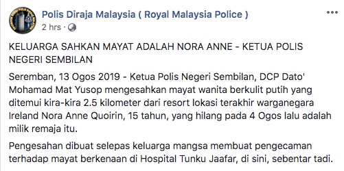 Nora, along with her parents and two siblings, arrived at the Negri Sembilan resort on August 3; however, when the family awoke the following morning, the teen was not in the room she shared with her siblings. A window, accessible only from the inside of the house, was open, but few clues indicated what had occurred.