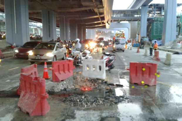 The Star Online reports that the pipe — located along the Grand Saga Expressway, close to the Cheras Leisure Mall had burst due to MRT works.