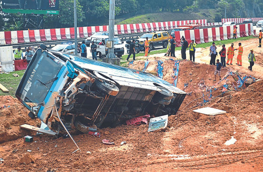 KL Fire and Rescue Department director Khiruddin Drahman said the driver was believed to have lost control, causing the bus to swerve left and into a trench pipe dug for an underground pipe, sweeping construction cones out of the way. A distress call was received by the Sri Hartamas fire station at 9.42am.