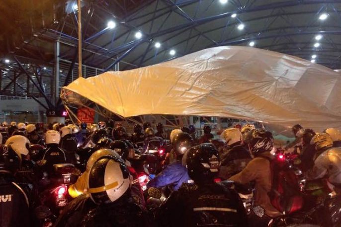 The usually slow Singapore-bound traffic in the morning rush hour at Tuas Checkpoint got even more sluggish today when harsh winds and pelting rain caused an entire canopy to collapse.