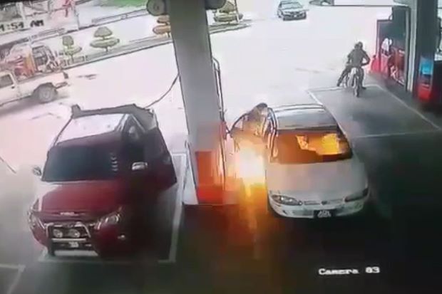In the 46-second clip, the boy’s mother was seen refuelling her Proton Wira at a Caltex station in Kuala Krai moments before it caught fire from within.