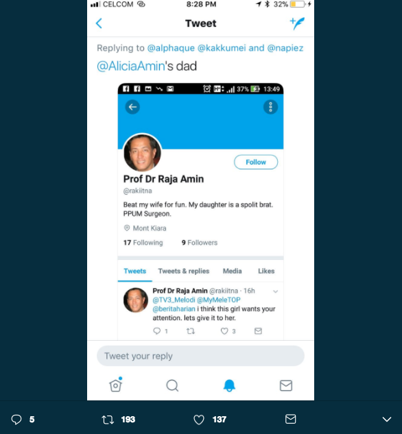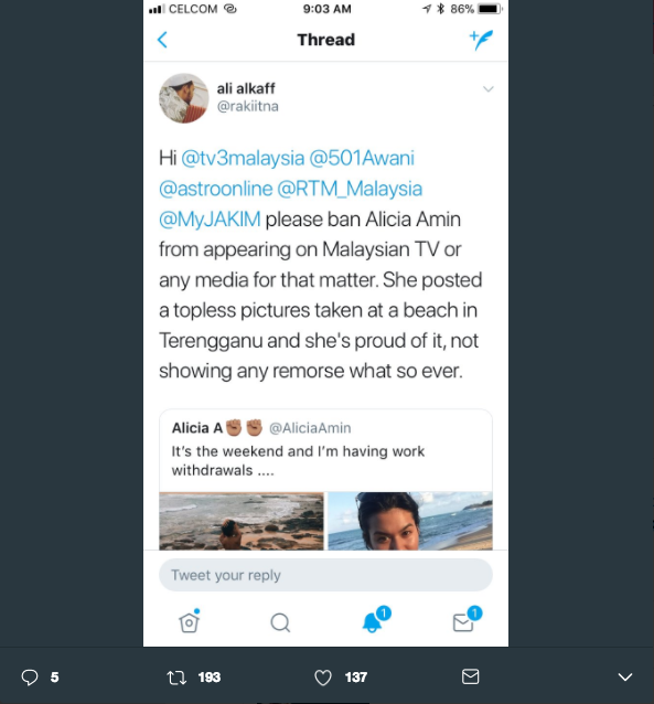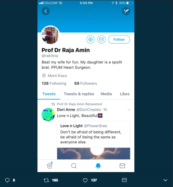 The fake account, professing to be Dr. Raja Amin, renowned heart surgeon, tweeted at national broadcasters TV3 and RTM, Astro cable and productions, and JAKIM (Malaysia’s Islamic Affairs bureau), asking them to ban his daughter from Malaysian TV. Why? Oh, you know, because she posted a picture to an Instagram account of herself on the beach, something that in no way violates the site’s guidelines, but obviously offended someone with nothing better to do than follow an account of a person they clearly don’t like.