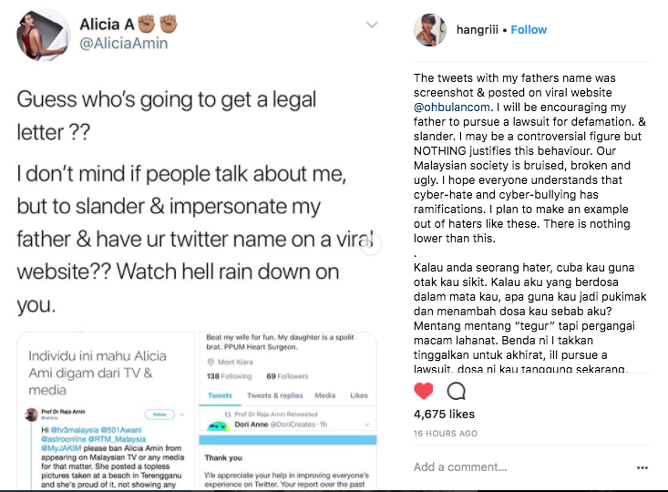 Alicia Amin, who has gained fame as an outspoken contestant on Asia’s Next Top Model, occasional vlogger, recent star of TV3 drama, and all around badass when it comes to speaking her mind and just living her life, has had her fair share of internet trolls.