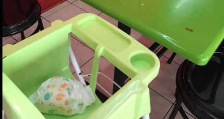Social media user Noor Akmar, proprietor of Restoran Bisik Bisik in the Kuala Lumpur suburb of Shah Alam’s seksyen 7 neighborhood, took a photo of the table that one family had recently vacated. In addition to the dirty plates and scattered bits of rice on the table, the group left behind one special surprise on a high-chair: a purportedly hefty, crap-filled diaper.
