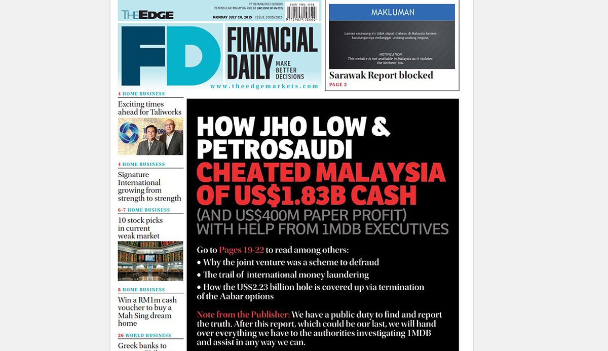 Financial newspaper The Edge has put out a comprehensive exposé on Malaysian billionaire Low Taek Jho and Saudi Arabian firm PetroSaudi’s alleged plot to siphon off money from Malaysia’s sovereign development fund 1Malaysia Development Berhad … despite it being what its editorial board fears might be the article that shuts the paper down.