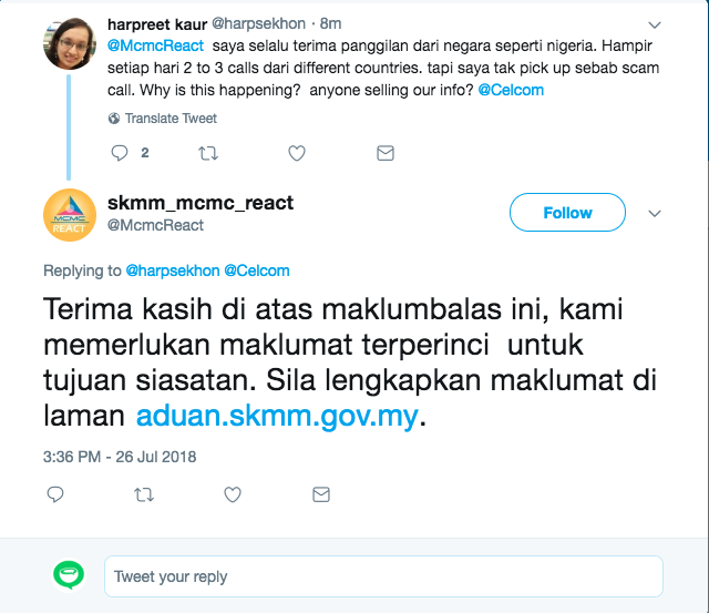 Grievances can be tweeted to @MCMCReact, and you can expect interactions like this concerned citizen, who is worried that our telco information is being sold to Nigerian scammers:
