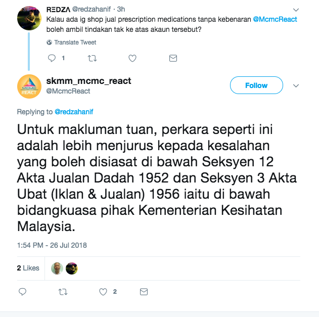 Another user wants to know if it’s illegal and of MCMC interest that a local pharmacy is selling pill prescriptions without a doctor’s approval.