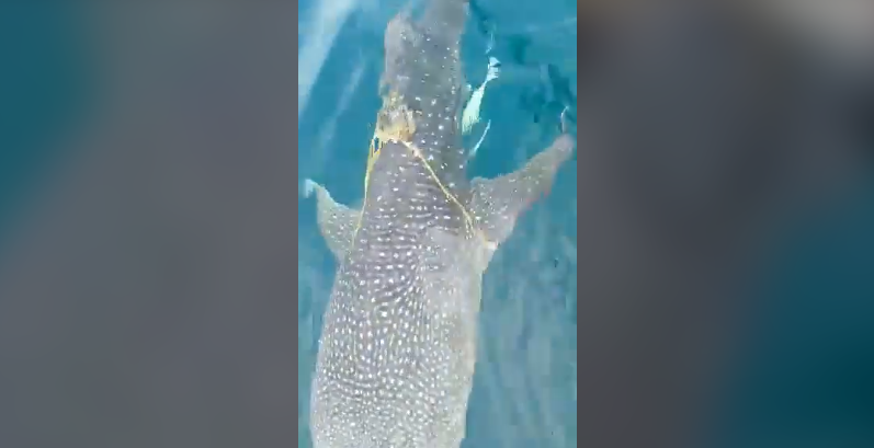 In the two-minute long clip, one of the men can be heard saying that he believed the animal was asking for assistance, as it waited calmly for them to figure out how to remove the rope. Eventually the men used a long hook to lift the rope away from the whale shark’s back, and then cut it with a cleaver, setting the animal free.