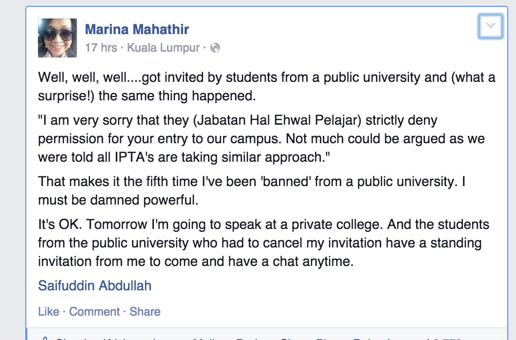 Marina reproduced the message conveyed to her by the student: “I am very sorry that they (Jabatan Hal Ehwal Pelajar – Students’ Affairs Department) strictly deny permission for your entry to our campus.”