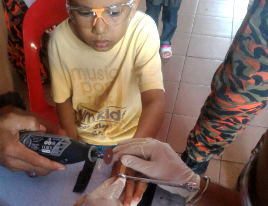 As a final resort, the parents decided to drive over to the Kulim Hi Tech Fire and Rescue Department to ask the firemen for help. After assessing the situation, the firemen decided to use a grinder to saw off the spanner.