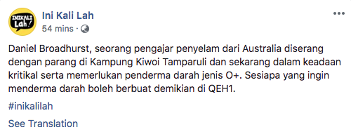 Nearby villagers went to the aid of the man, who reportedly runs a local home stay along with his Malaysian wife. He has lost a fair amount of blood and currently being treated at Queen Elizabeth Hospital in Kota Kinabalu.