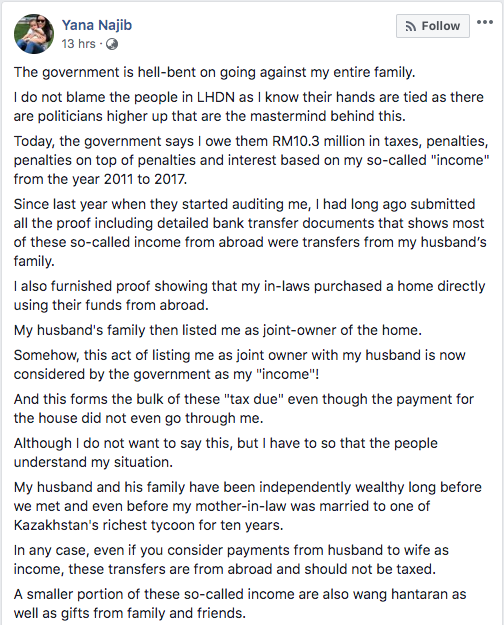 The Malaysian government is alleging that Nooryana should have submitted an individual income tax return form to the IRB for those in-flows of cash.