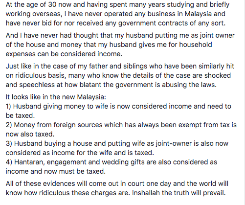 Nooryana Najwa, daughter of former Prime Minister Najib Razak and his wife, Rosmah Mansor, has been active on Facebook of late, sharing not only her libertarian-inclined ennui at having to cough up unpaid taxes for sundry “gifts,” but also her thoughts on Malaysia’s governing foundations – we think?
