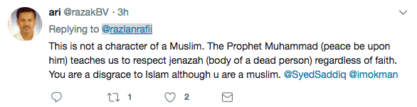 Twitter user @saiful_izzan wrote that the Prophet Muhammad always maintained that one should respect the remains of those from all faiths.