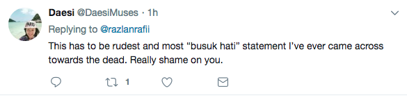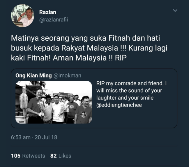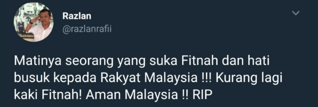 “A person who likes to slander and possesses a ‘vile heart’ hati busuk towards Malaysians is dead. One less person who slanders! Malaysia is peaceful! RIP.”