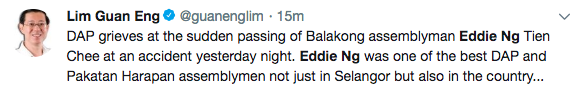 The tragic death of DAP assemblyman Eddie Ng early this morning as he drove from Kuala Lumpur to Kajang saw many condolences expressed from both sides of the political arena.