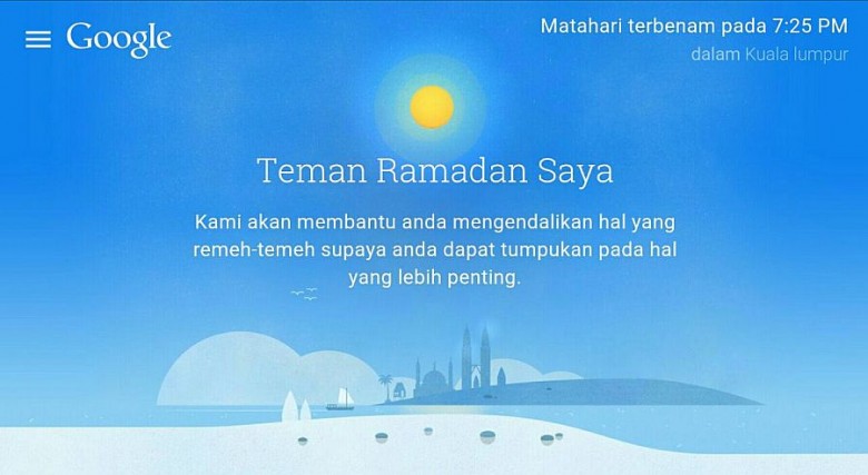 Laman ‘Teman Ramadan Saya‘ menampilkan antaramuka seakan kad Google Now. Pengguna akan dihidangkan dengan pelbagai perkara berkaitan Ramadan seperti video siaran langsung dari Masjidil Haram, aplikasi berguna, Pasar Ramadhan berhampiran, Resepi berbuka waktu imsak & waktu berbuka serta macam-macam lagi.