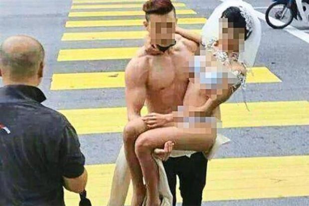 That’s what happened in the usually uneventful streets of Ipoh yesterday morning as a pair of newlyweds were seen moving about the Jalan Sultan Yussof area having their wedding photos taken in revealing (and matching) get-ups: the groom was topless except for a Chippendales-esque bow tie, and the bride was in virginal white lingerie, high heels, and the bride’s customary veil.